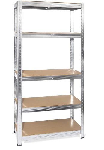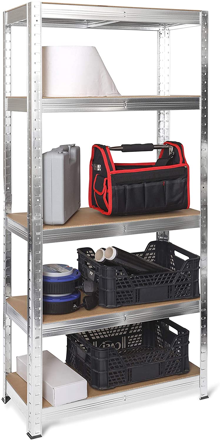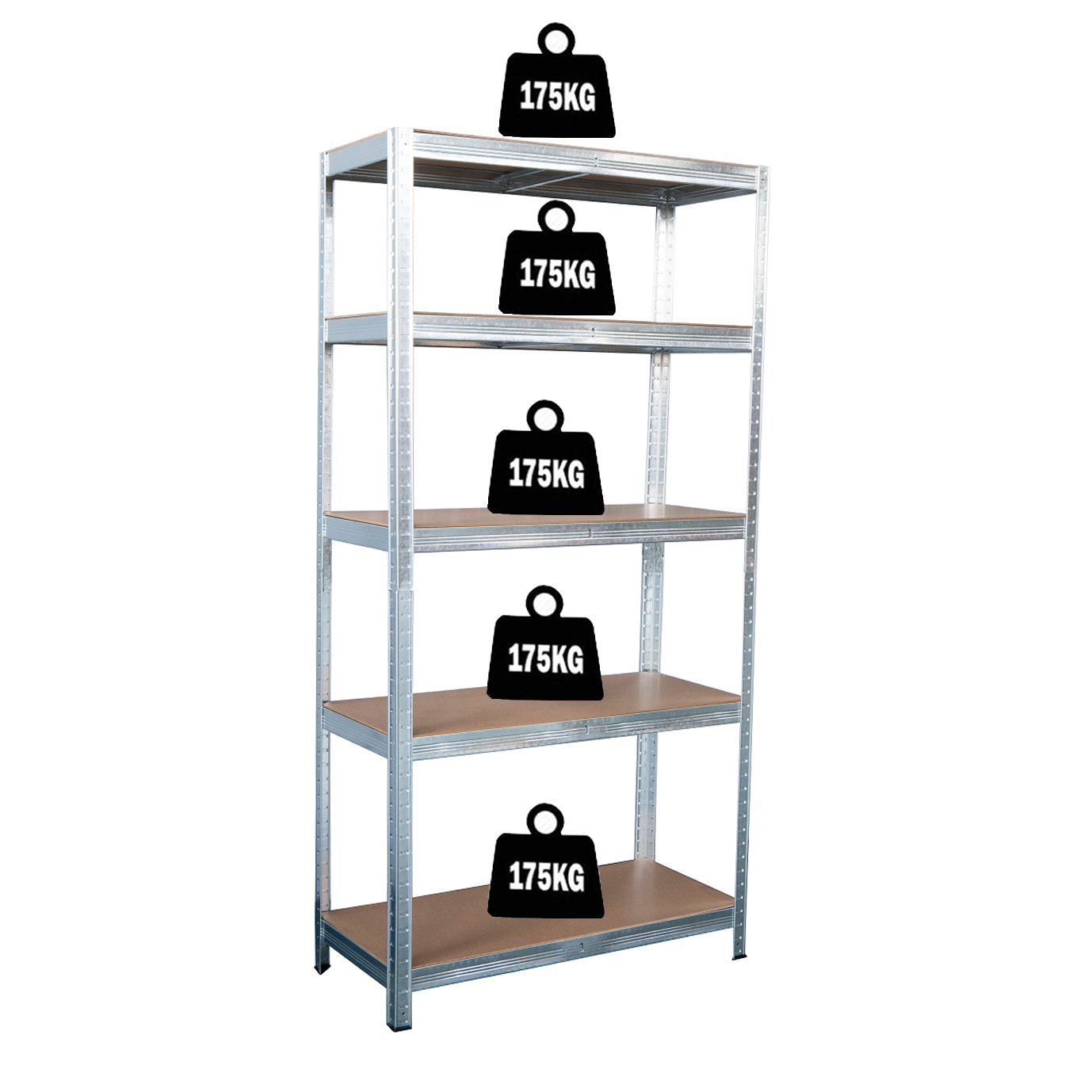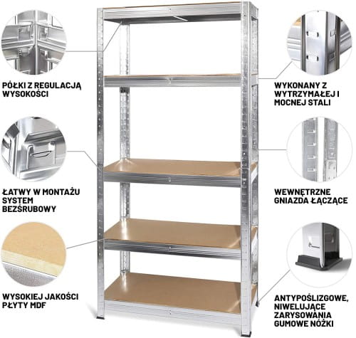 Regał składa się z 5 solidnych półek oraz dwóch kompletów słupów nośnych. Półki wykonane są z mocnego MDF, a każda posiada dodatkowe wzmocnienie w postaci środkowego wspornika. Maksymalna nośność półki to 175kg, zaś całego regału to 875kg.